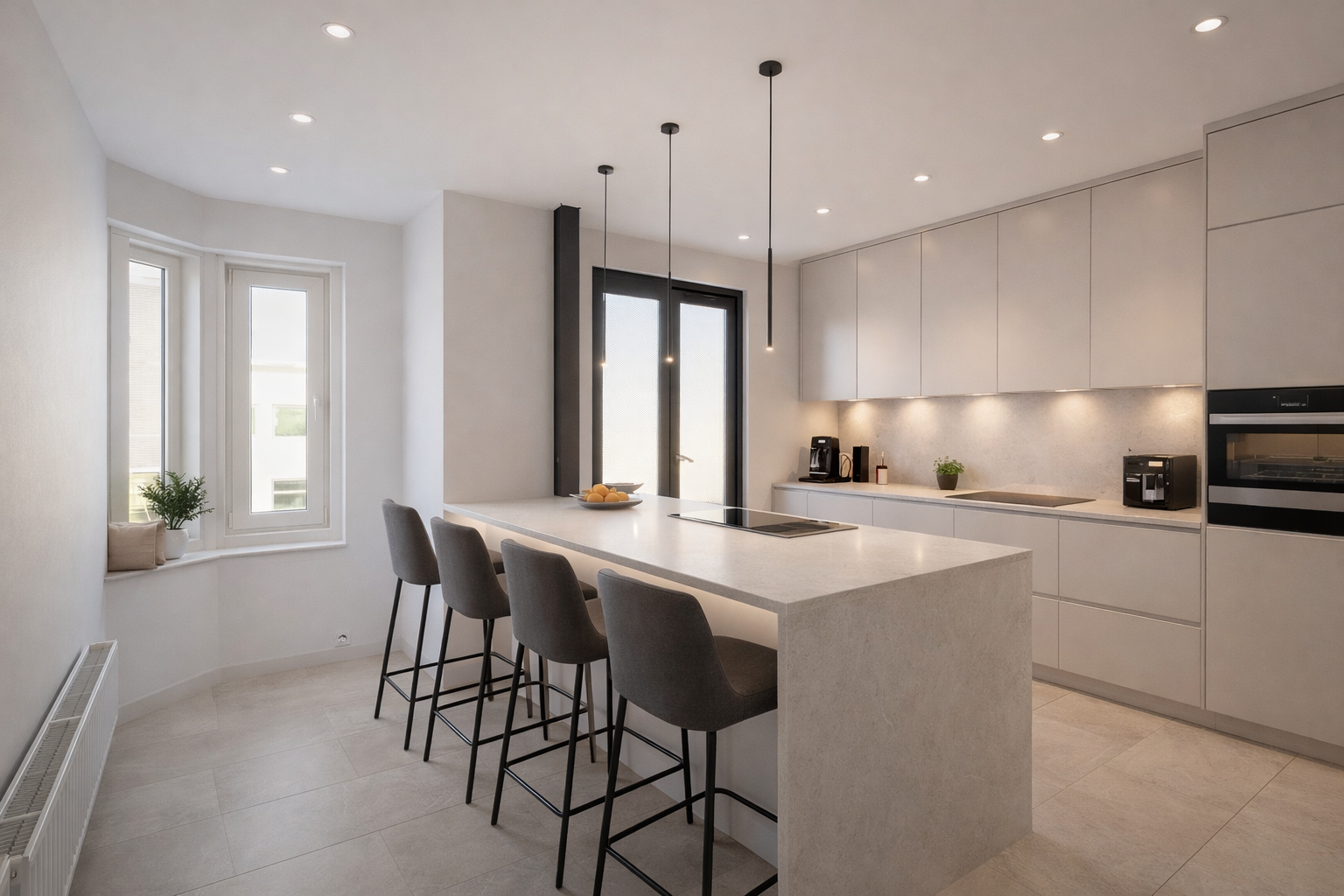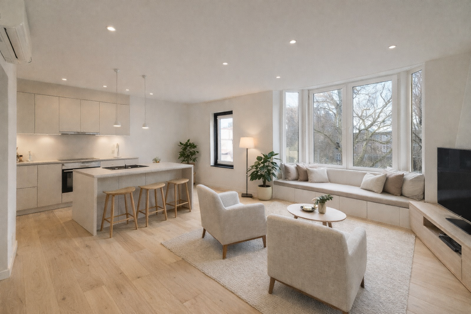 De lichte en sfeervolle woonkamer (4.40 x 6.63 m) beschikt over een fraaie erker en biedt een prachtig, vrij uitzicht op de karakteristieke kruising Noordsingel/Bergsingel. Dankzij de raampartijen en hoekligging geniet de ruimte van veel natuurlijk licht, wat zorgt voor een aangename woonbeleving.