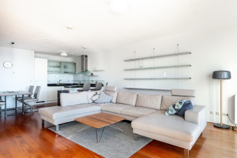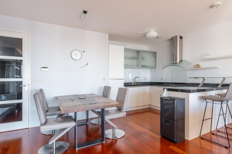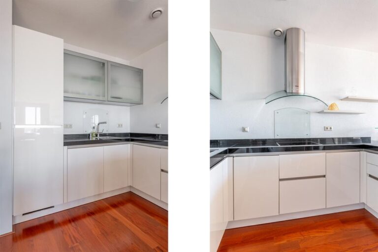 Beautiful bright and large living room 46m2 (817 x 556) with open kitchen and patio doors to French balcony of glass. Through the windows that reach to the ground there is a magnificent view over the most beautiful part of Rotterdam.