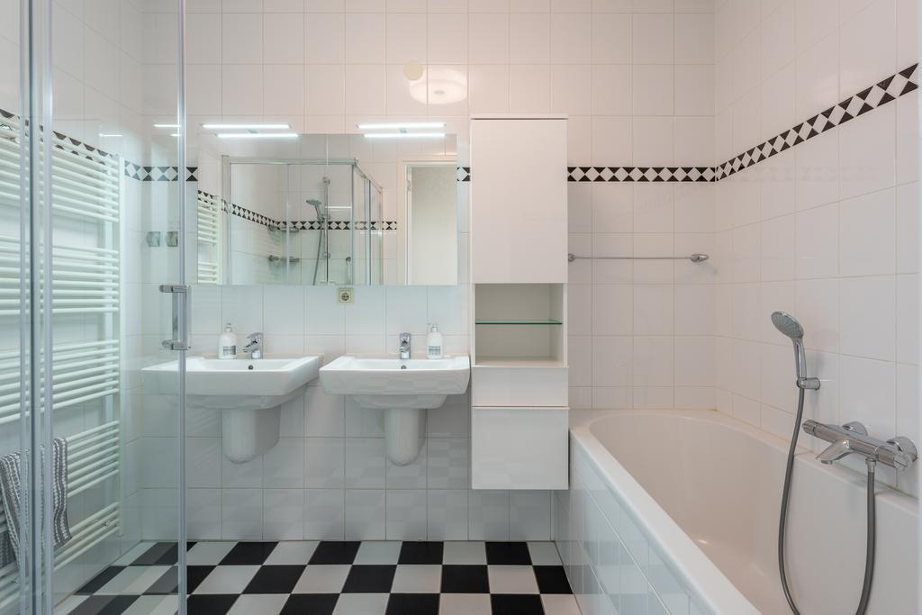 Very bright master bedroom 19m2 (595 x 335) with fully tiled bathroom en suite with bath, double sink, glass shower cabin and design radiator.