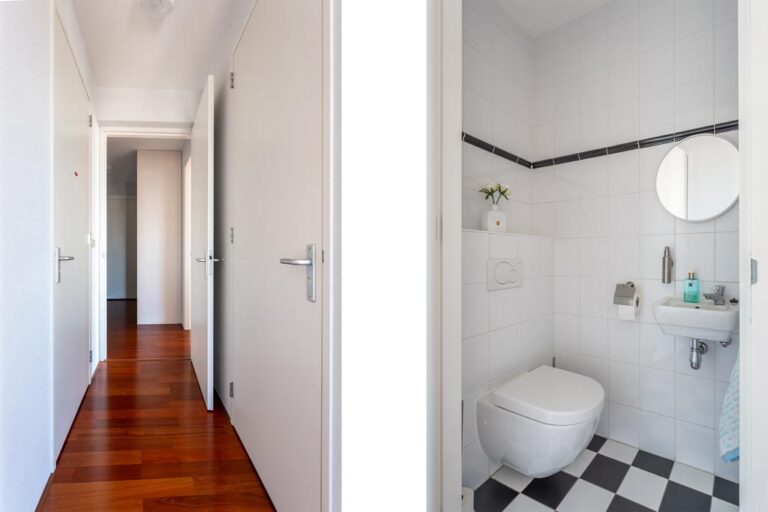 Royale hal met meterkast en hangend toilet met fonteintje geheel betegeld tot plafond.