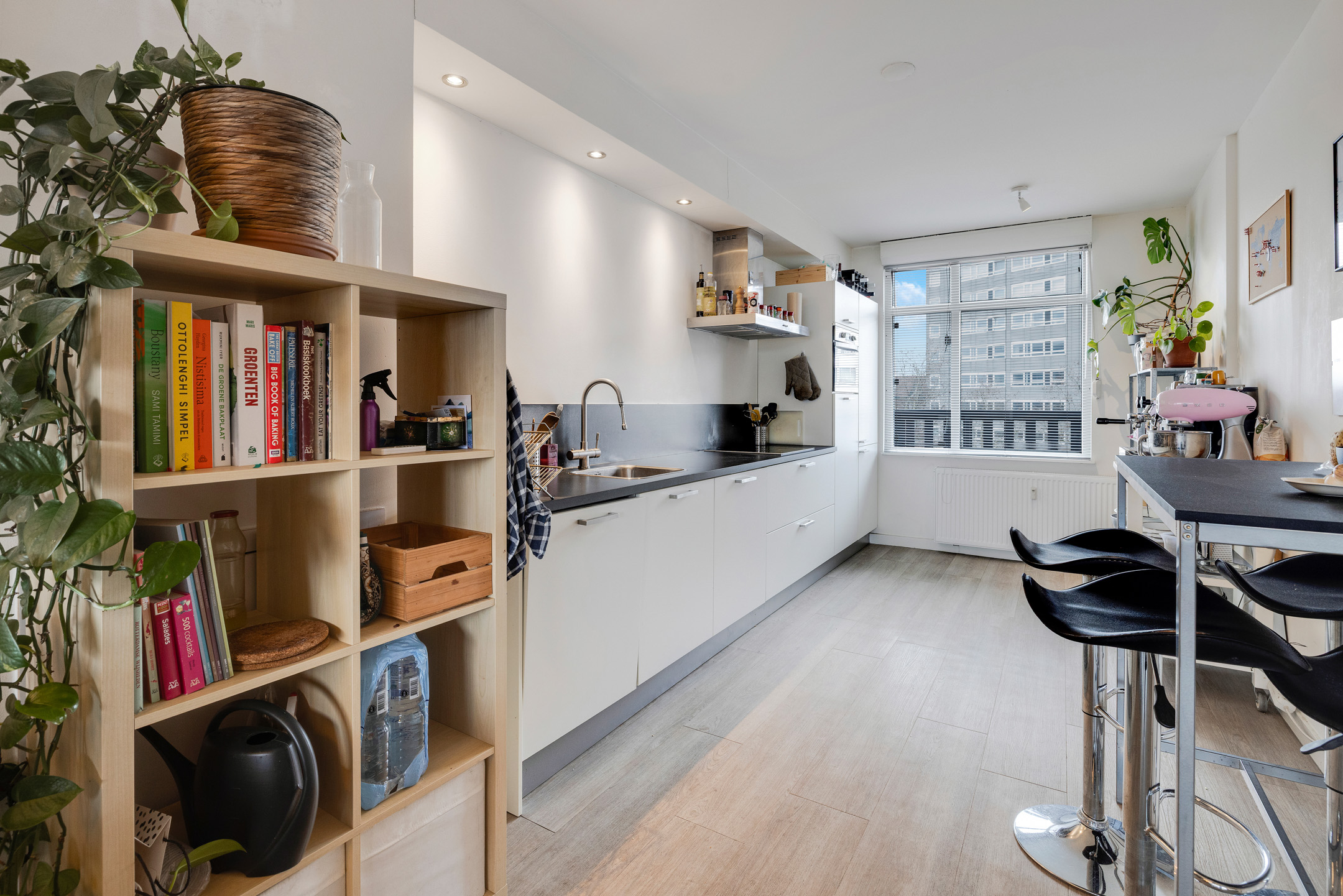 Speelse, lichte living (5.38 x 4.90) met open keuken, speels zijraam en toegang tot het balkon (1.32 x 4.50), waar u kunt ontspannen en genieten van het stadse uitzicht.
