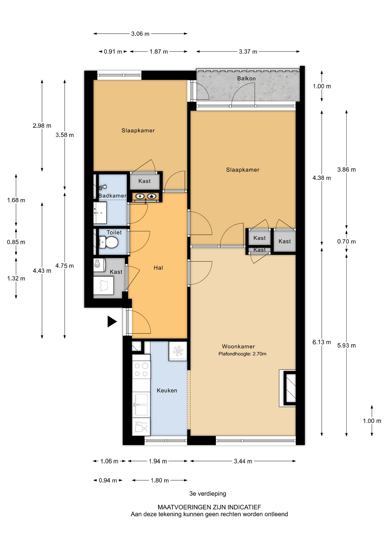 Slaapkamer I (3.58 x 3.06) met inbouwkast en toegang tot het balkon (Oost) (1.00 x 3.37).