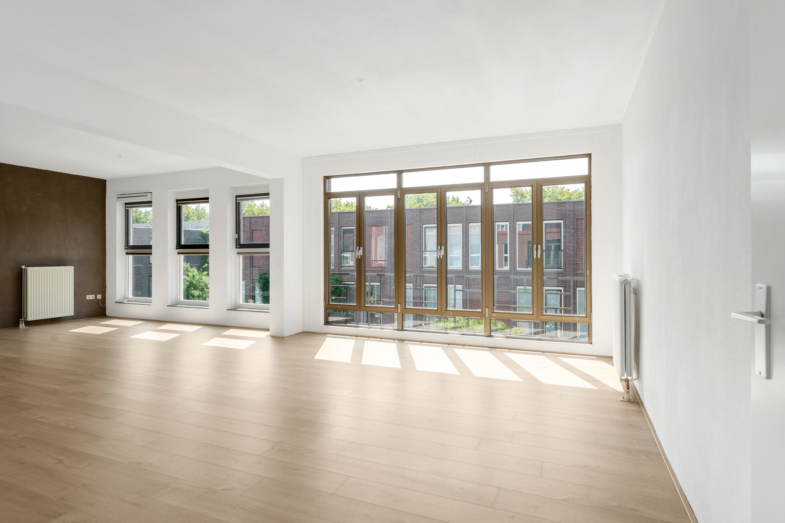 Prachtig lichte woonkamer (5.44 x 9.14, plafondhoogte 2.72m) met fantastische raampartijen, deels voorzien van fransbalkon en open keuken.