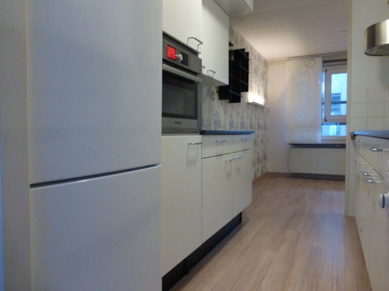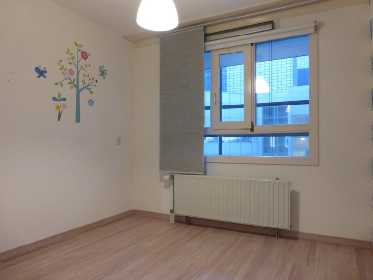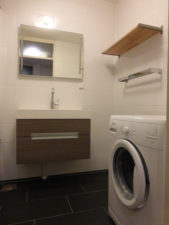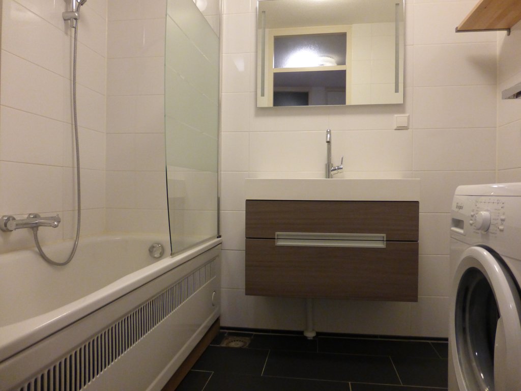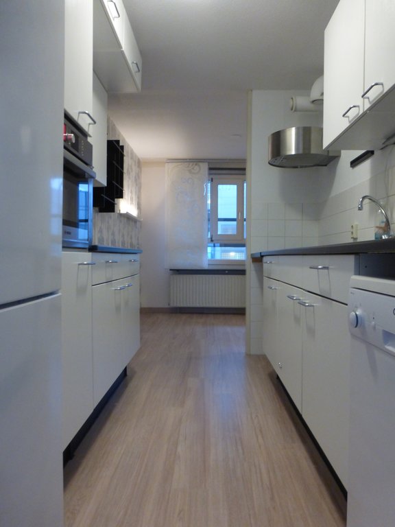 Entrance, long hallway with meter cupboard and renovated toilet with washbasin. Spacious and bright (because of large windows) living/ dining room and access to the indoor loggia. Closed kitchen with a lot of storage space and various equipment such as new fridge and separate freezer, induction stove, dishwasher, combined microwave and oven. Bedroom I (master) at the loggia side, you can see the city skyline right from your bed! Bedroom II is spacious and located at the walkway side. Fully renovated modern bathroom with bath and shower in 1, wash basin and washing machine.