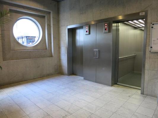 Afgesloten hoofdentree, brievenbussen, bellentableau, liften en trappenhuis.