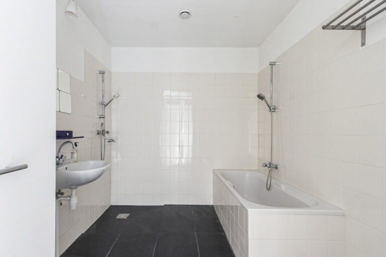 De badkamer (3.00 x 2.45) is voorzien van een douche, wastafel en ligbad.
