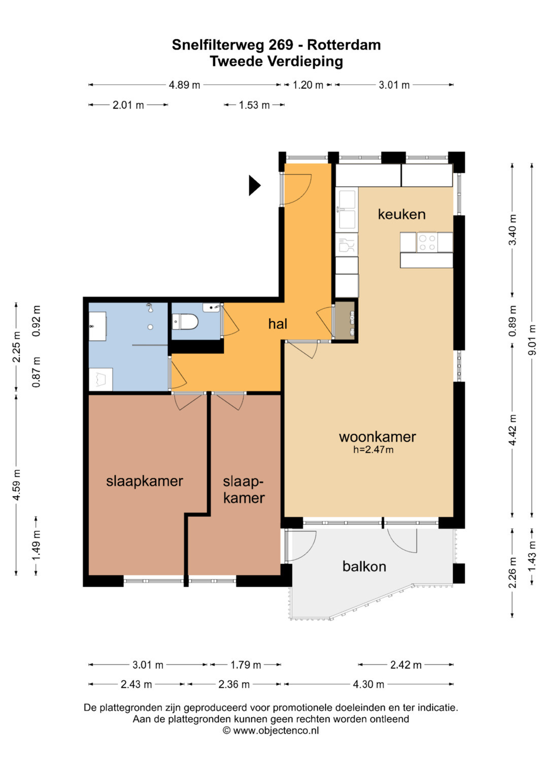 Slaapkamer I (4.59 x 3.01/2.43), slaapkamer II (4.59 x 2.36/1.79).