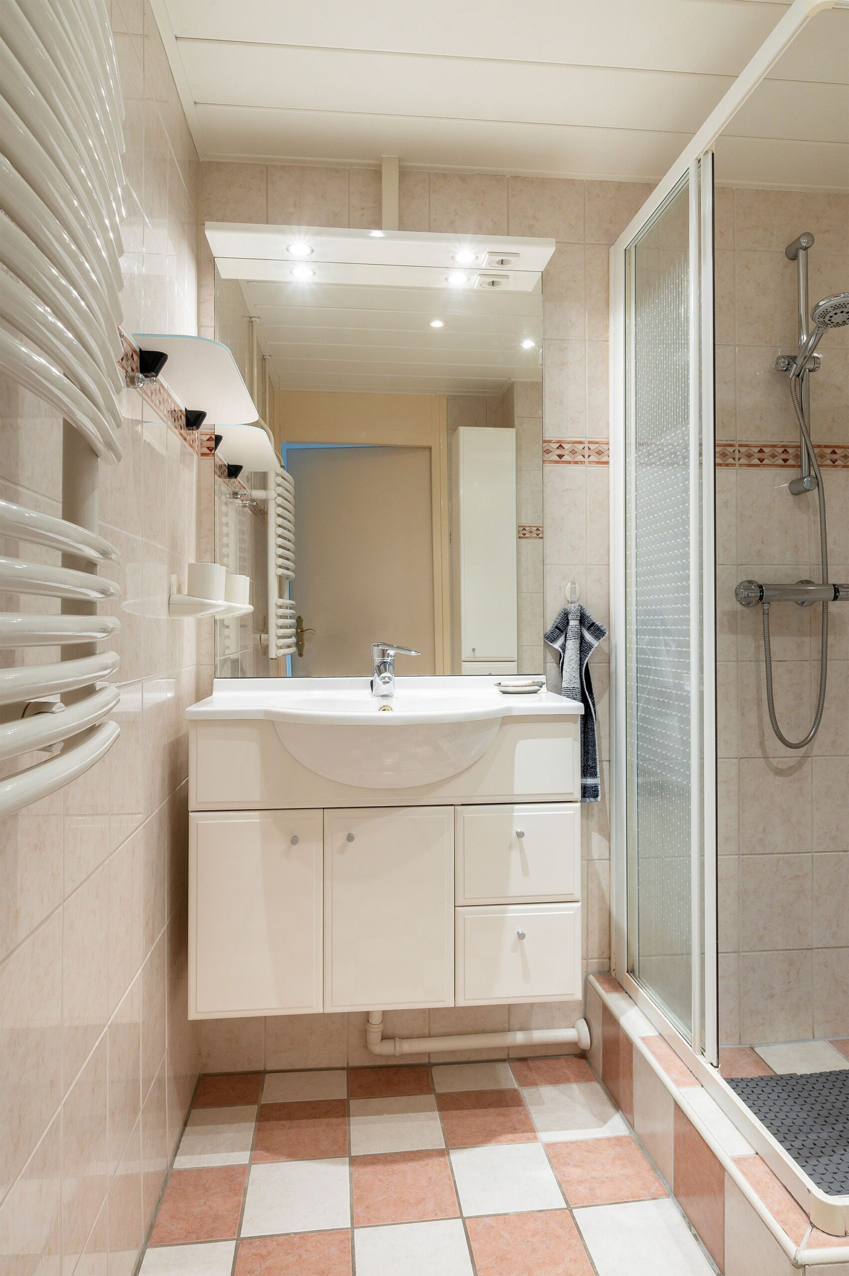 Badkamer met douche, handdoekradiator, wastafel, wasmachine en droger.